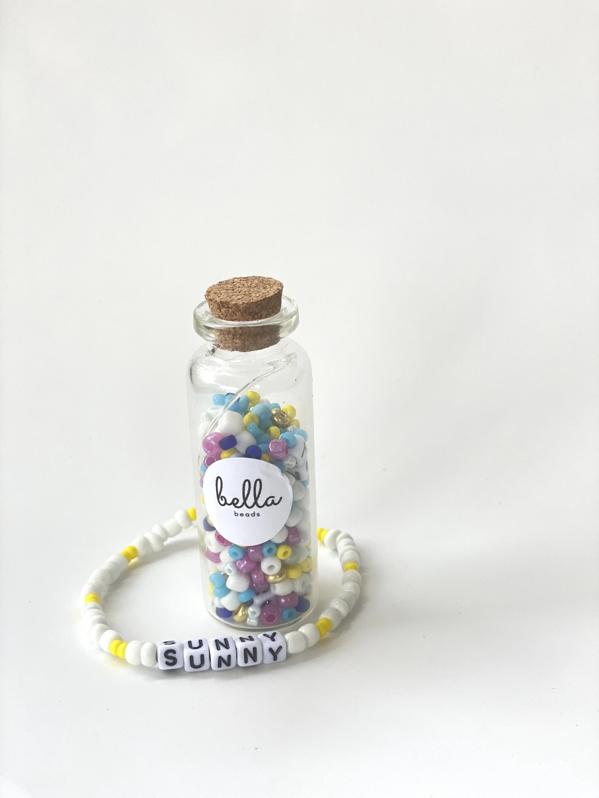 Our Bella Beads word “Bracelet in a Bottle” kit comes in a glass jar with glass seed beads, letter beads and one pre-tied string. You can customize the colors and the letter beads.